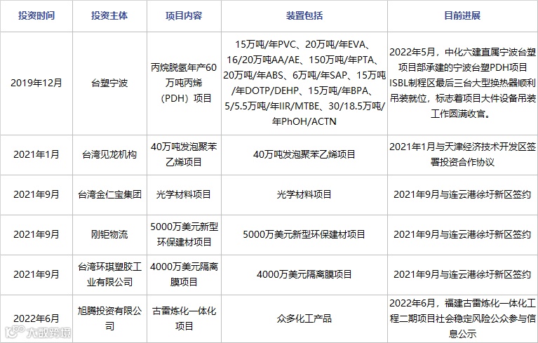 在这样的背景下,中国台湾省化工企业就选择频繁在中国内地的投资。根据不完全统计,中国台湾省化工产业在中国内地的投资项目数量不少于10个,投资产业涉及到基础化工品、新材料及精细化学品等, 投资的区位在天津、福建、浙江、江苏等省份。