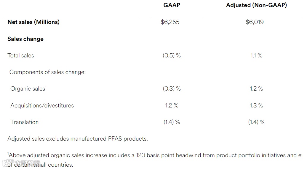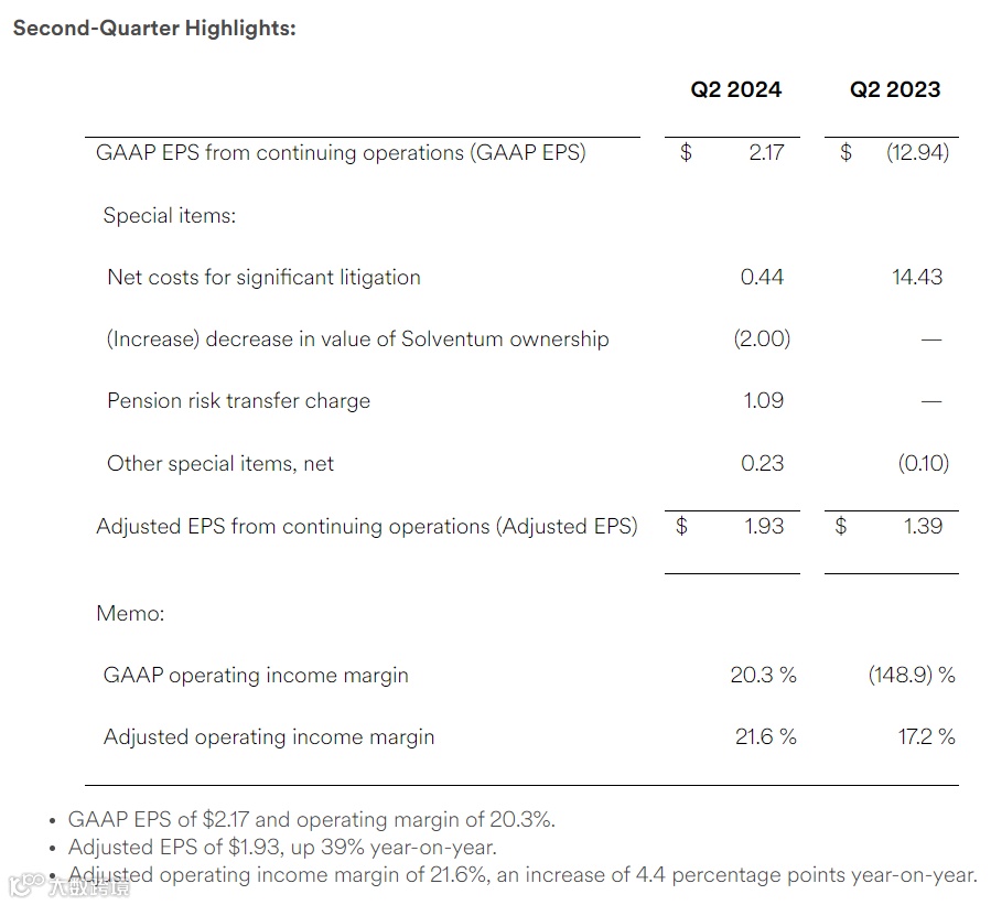 2024年第二季度,3M实现销售额63亿美元(约456.8亿),同比下降0.5%;调整后销售额为60亿美元,有机增长1.2%;经营现金流为10亿美元,调整后自由现金流为12亿美元。调整后营业利润率为21.6%,同比增长4.4个百分点。