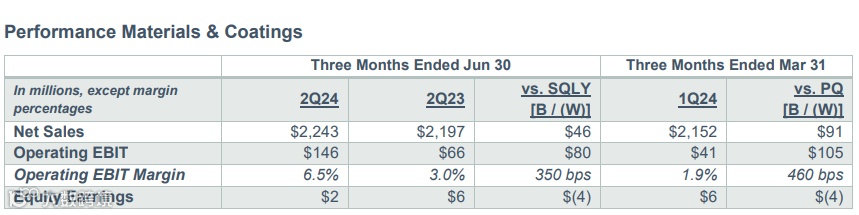 高性能材料和涂料部门,本季度净销售额为22亿美元,同比增长2%,销量同比增长7%;净销售额环比增长4%;营业息税前利润为1.46亿美元,与去年同期相比增加了8000万美元,环比增长1.05亿美元。