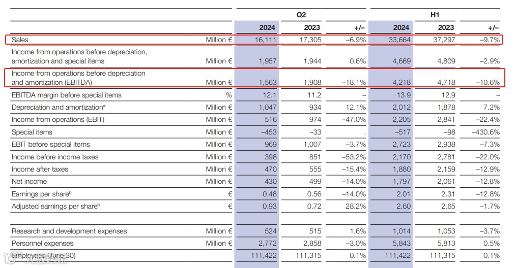 2024年二季度,巴斯夫集团销售额为161亿欧元,较去年同期下降12亿欧元(2023 年二季度为173亿欧元)。主要原因是:所有业务领域价格下跌,不利的汇率因素以及轻微的资产组合影响也一定程度上导致销售额下降。扣除一次性支出后的息税折旧及摊销前利润(EBITDA)增至19.6亿欧元,同比增长0.6%。