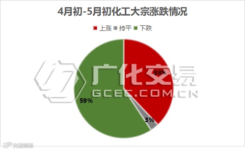 据广化君数据监测,5月初处于下跌趋势的化工原料占59%,上涨化工品仅占38%。市场整体呈现涨少跌多的状态。