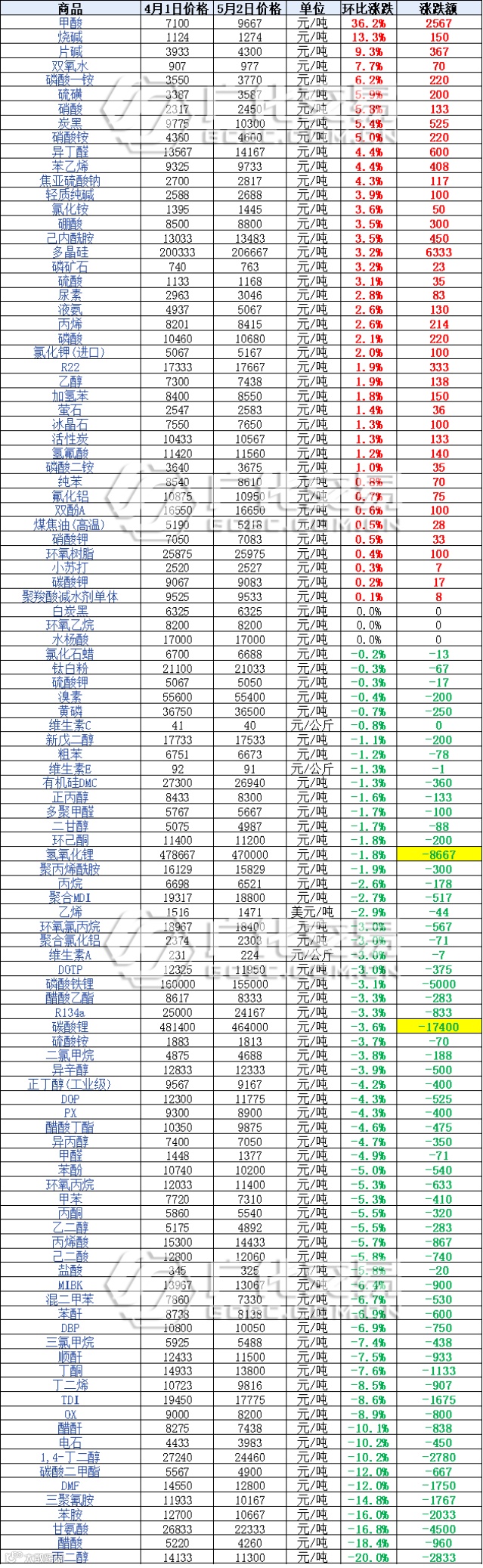 碳酸锂:5月2日报价464000元/吨,较4月初下跌17400元/吨,跌幅为4%;