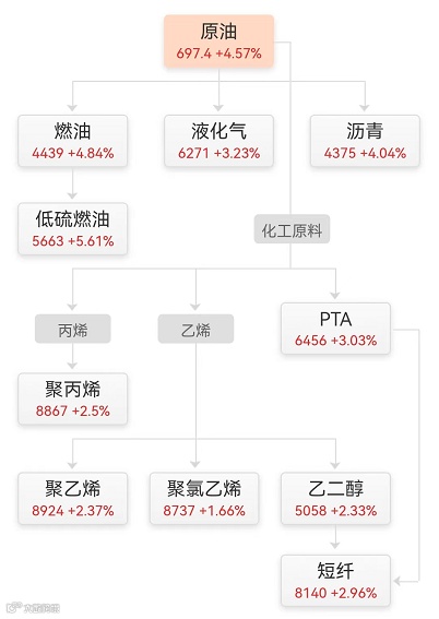 化工期货市场也在原油带动下回涨。