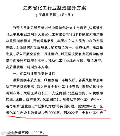 *截图信息来自于2019年4月27日发布的《江苏省化工产业安全环保整治提升方案》