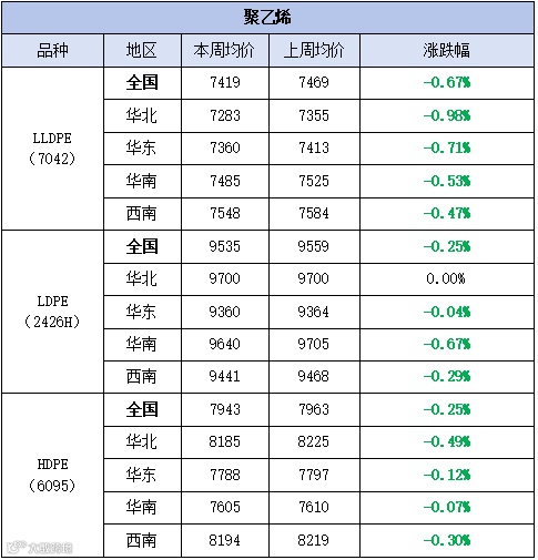 本周聚乙烯市场震荡弱行,价格重心下跌。LLDPE(7042)市场均价为7419元/吨,较上周均价下跌50元/吨,跌幅为0.67%;LDPE(2426H)市场均价为9535元/吨,较上周均价下跌24元/吨,跌幅为0.25%;HDPE(6095)市场均价为7943元/吨,较上周均价下跌20元/吨,跌幅为0.25%。