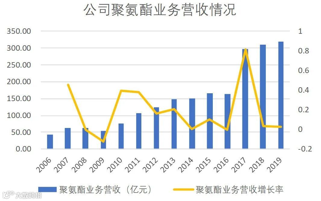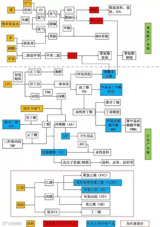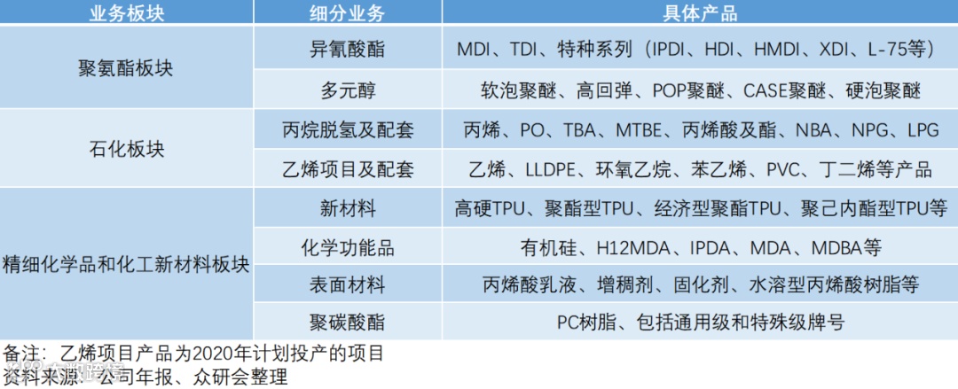 万华公司业务主要分为三大板块:第一,聚氨酯业务:涵盖MDI、TDI、聚醚多元醇等聚氨酯产业集群;第二,石化业务:丙烯及其下游的丙烯酸及酯、环氧丙烷,目前在建的乙烯及其下游LLDPE和环氧乙烷等;第三,功能化学品及材料业务:主要涵盖聚碳酸酯、SAP、水性PUD、PA乳液、TPU、ADI系列等。