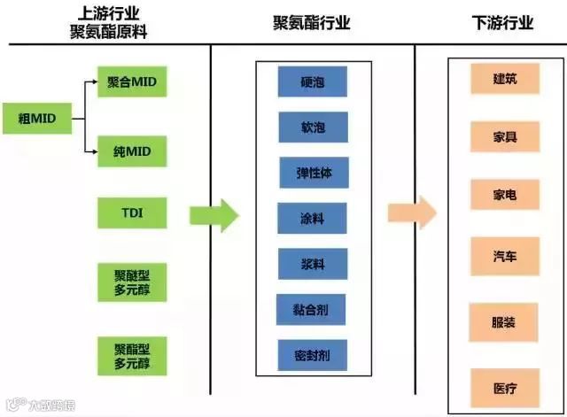 MDI是制造聚氨酯高分子材料最重要而且不可替代的原料,由于聚氨酯其优异的性能可以制成软质、半硬质及硬质泡沫塑料、弹性体(聚氨酯弹性体简称为TPU)、油漆涂料、胶粘剂、密封胶、合成革涂层树脂、弹性纤维等,广泛应用于汽车制造、冰箱制造、交通运输、土木建筑、鞋类、合成革、织物、机电、石油化工、矿山机械、航空、医疗、农业等许多领域。