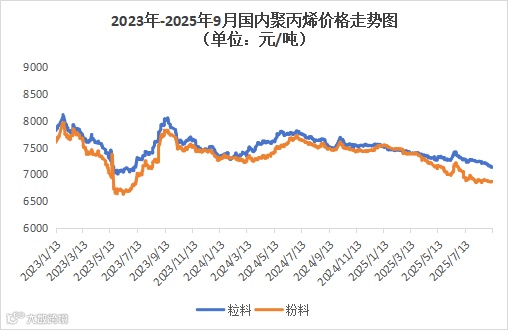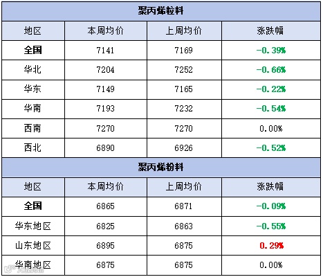 本周聚丙烯市场弱势整理,价格重心小幅下移。粉料全国均价为7141元/吨,较上周均价下跌28元/吨,跌幅为0.39%。粒料全国均价为6865元/吨,较上周均价下跌6元/吨,跌幅为0.09%。