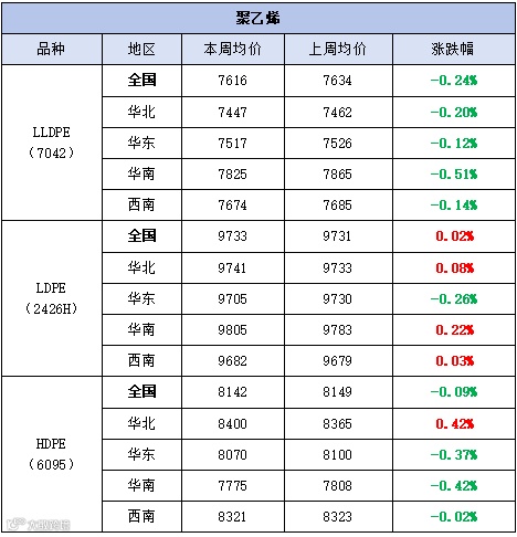 本周聚乙烯市场震荡整理,价格跌多涨少。LLDPE(7042)市场均价为7616元/吨,较上周均价下跌18元/吨,跌幅为0.24%;LDPE(2426H)市场均价为9733元/吨,较上周均价上涨2元/吨,涨幅为0.02%;HDPE(6095)市场均价为8142元/吨,较上周均价下跌7元/吨,跌幅为0.09%。