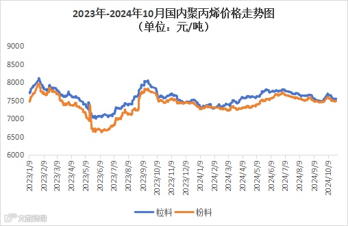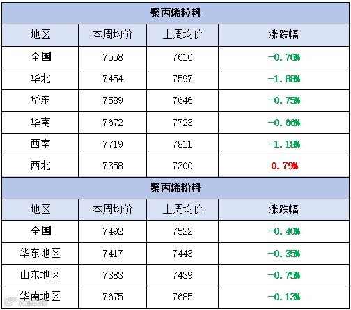 本周聚丙烯市场偏弱运行,价格以跌为主。粉料全国均价为7558元/吨,较上周均价下跌58元/吨,跌幅为0.76%。粒料全国均价为7492元/吨,较上周均价下跌30元/吨,跌幅为0.40%。
