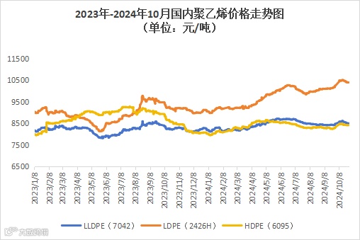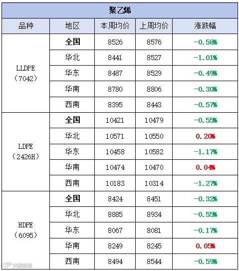 本周聚乙烯市场震荡走弱,价格下跌为主。LLDPE(7042)市场均价为8526元/吨,较上周均价下跌50元/吨,跌幅为0.58%;LDPE(2426H)市场均价为10421元/吨,较上周均价下跌58元/吨,跌幅为0.55%;HDPE(6095)市场均价为8424元/吨,较上周均价下跌27元/吨,跌幅为0.32%。