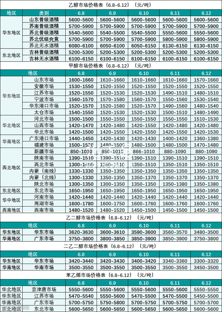 醇类报价(6.8-6.12)