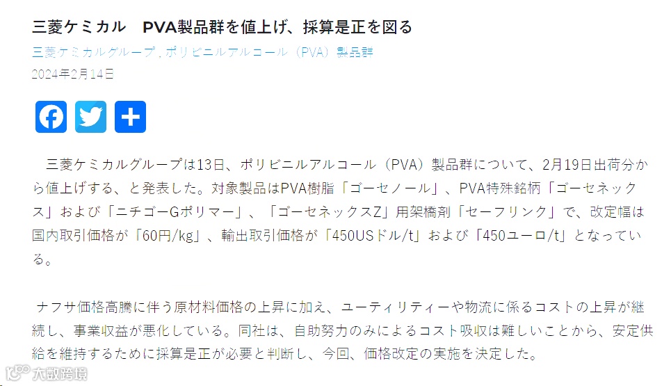 ▶▶三菱化学宣布PVA涨价2872元/吨!