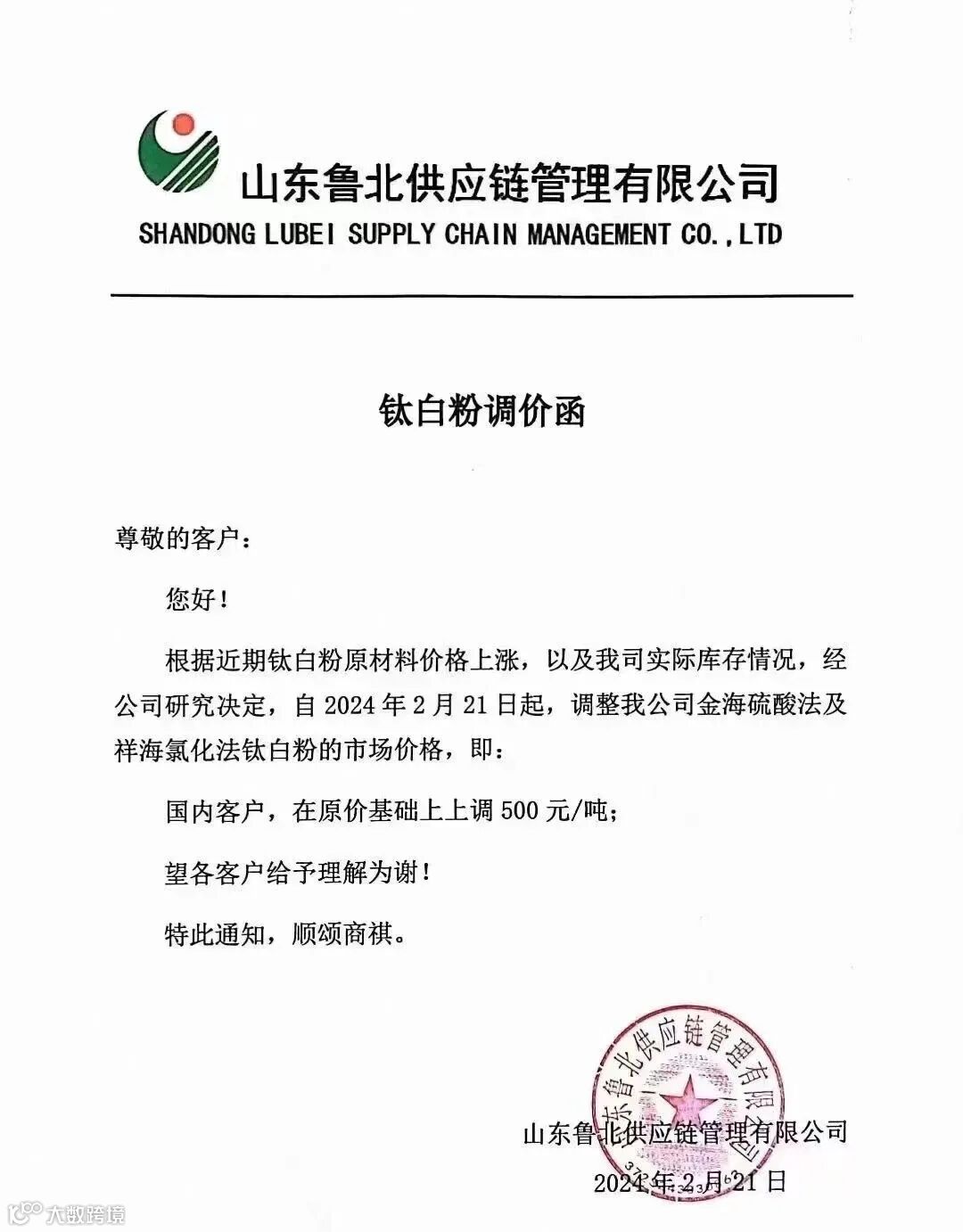▶▶山东鲁北供应链管理有限公司钛白粉,国内销售价格每吨调涨500元,国外销售价格每吨调涨100美元。