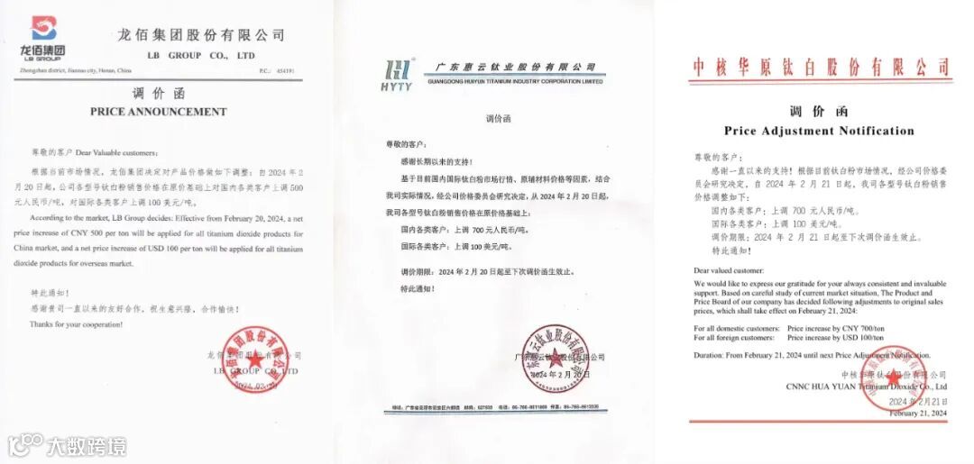 2月20日,钛白粉龙头企业龙佰、惠云发布调价函。之后康诺斯和超彩环保也纷纷上调了钛白粉价格。2月22日,中核、安纳达陆续发布公告宣布涨价。从国外巨头这第一涨价函开始,国内钛白粉企业进入了集体调价阶段这是2024年以来,第二波涨价潮。