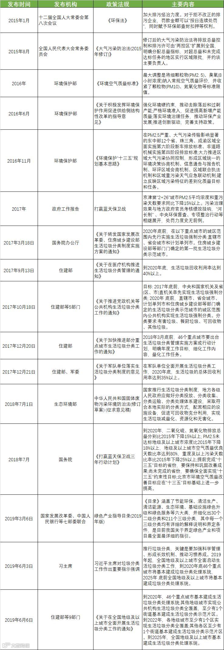 2018-2019年,我国环保政策密集出台,环保力度进一步加大,环保政策措施由行政手段向法律的、行政的和经济的手段延伸,第三方治理污染的积极性和主动性被充分调动起来。环保税、排污许可证等市场化手段陆续推出,政策红利逐步显现,政策盘点如下表: