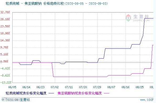 8月国内纯碱、硫磺价格持续回升,原料成本支撑下,部分厂家小幅上调焦亚硫酸钠市场价格,国内焦亚硫酸钠市场价格整体结束了连续近两年的跌跌不休之旅,8月焦亚硫酸钠整体触底回升6.02%。受国内纯碱库存持续走低影响,8月下旬开始国内纯碱价格一日一涨,甚至一日多涨,原料成本大幅走高,加工成本支撑下,国内焦亚硫酸钠企业纷纷上调出厂价格,带动9月国内焦亚硫酸钠市场价格大幅跟涨。