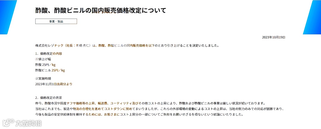 近期,日本昭和电工宣布自11月起上调公司乙酸、乙酸乙烯酯销售价格,涨幅在25日元/kg(约合1201元/吨)以上。