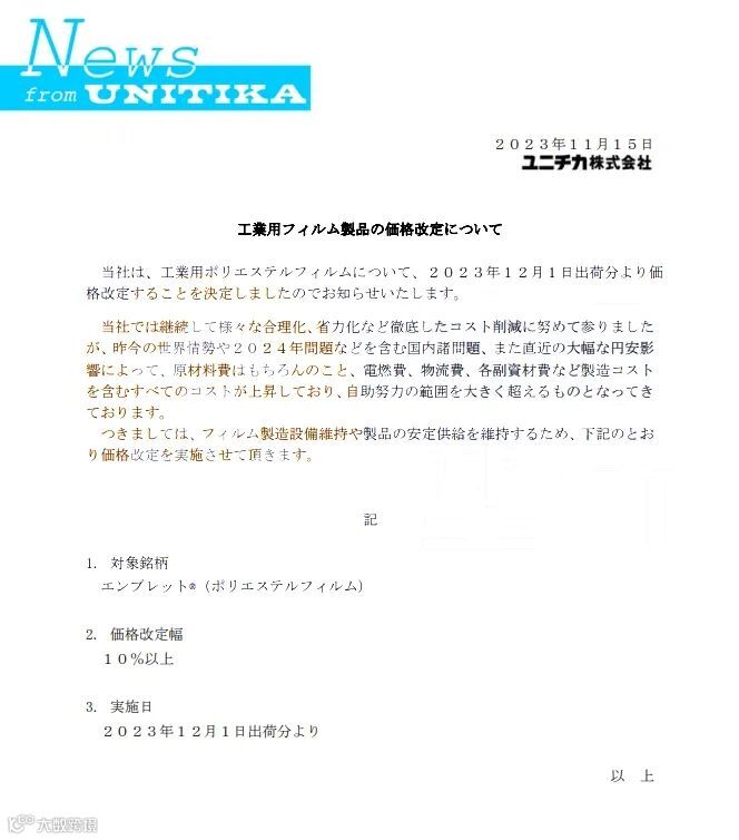 11月15日,尤尼吉可株式会社发布涨价通知,称由于近期的世界形势和国内外各种问题,包括原料、电燃费、物流费以及副材料等制造成本在都在上升,公司决定自12月1日起上调公司工业用薄膜(聚酯薄膜)产品价格,涨幅在10%以上。
