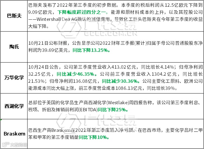 再看看所谓的行业巨头的业绩,在官方公布的2022第三季度业绩中,像巴斯夫、万华化学、陶氏这样的巨头业绩也都无一例外的出现大跌: