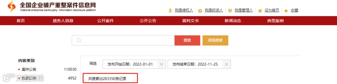 根据全国企业破产重整案件网披露的数据显示,从年初至今一共有283350条企业破产重整案件,平均下来每天就有将近860条企业破产重整案件。
