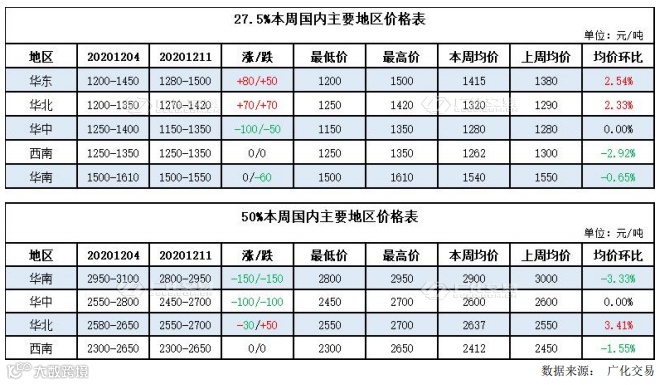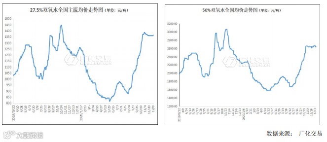 本周国内 27.5%双氧水主要地区市场主流均价 1362 元/吨,上周均价 1360 元/吨,周环比上涨 0.15%。