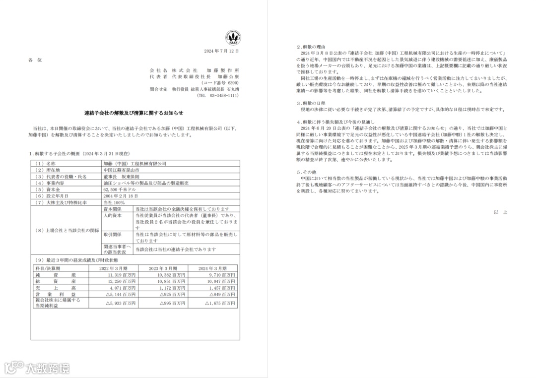 关于加藤中国解散的理由,加藤集团在2024年3月8日发布的“关于合并子公司加藤(中国)工程机械有限公司暂停生产”公告中曾有说明。近年来,由于中国房地产不景气导致的经济减退、建筑机械需求持续低迷,加上中国工程机械制造商的崛起,以及愈演愈烈的价格战等因素,致使加藤中国的业绩面临更加严峻的形势。