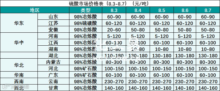 硫酸报价(8.3-8.7)