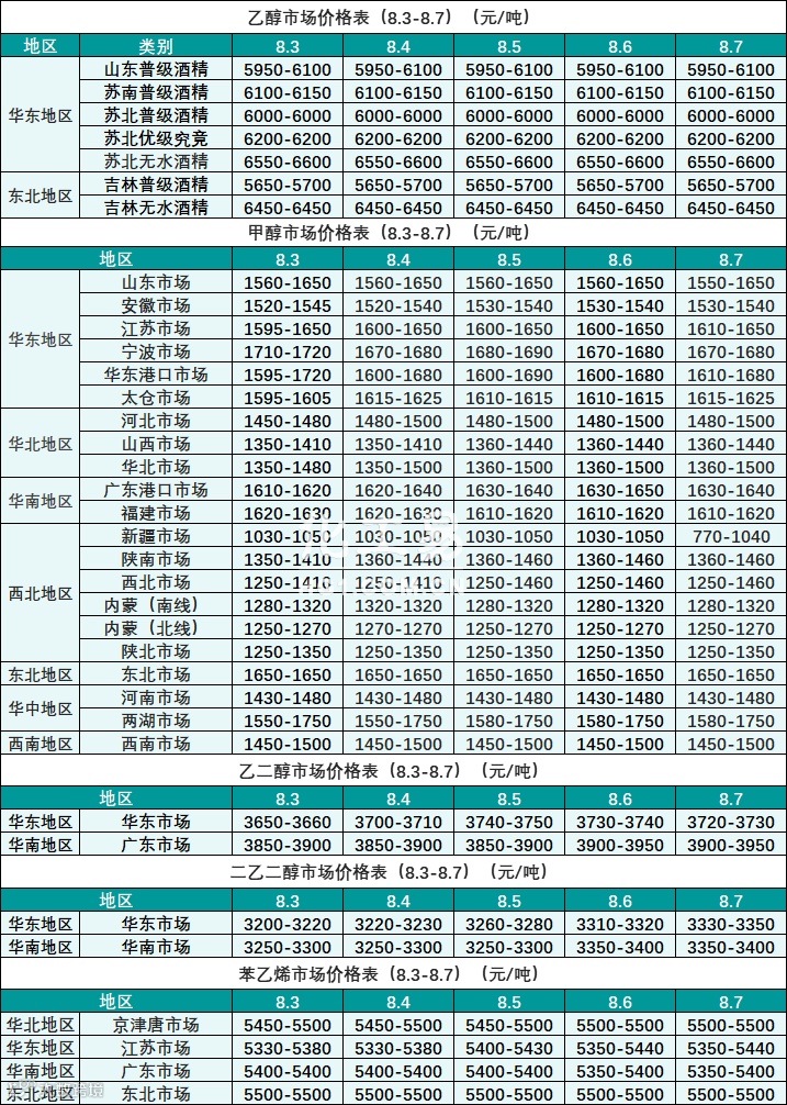 醇类报价(8.3-8.7)