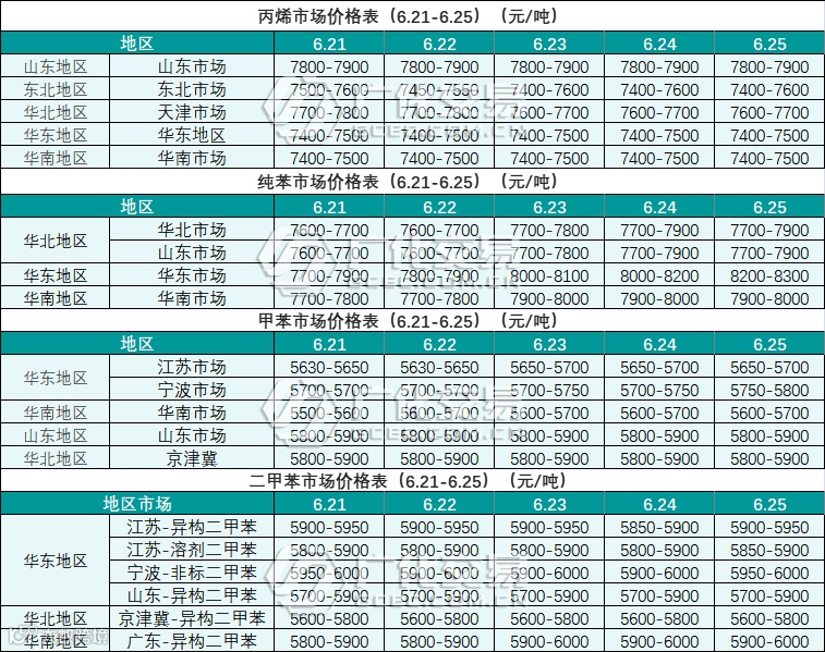 烃类报价(6.21-6.25)