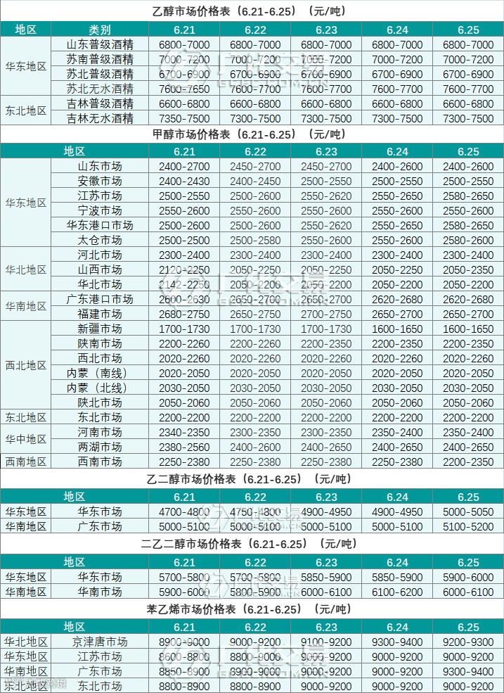 醇类报价(6.21-6.25)