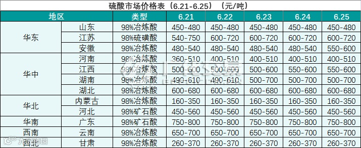 硫酸报价(6.21-6.25)