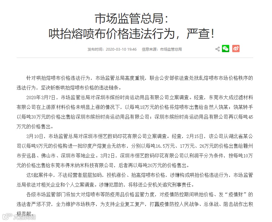 近日,据国家市场监督管理总局消息,总局要求地方市场监管部门对指定企业开展熔喷无纺布价格专项调查,要重点调查指定熔喷无纺布企业,优先办理熔喷无纺布价格投诉举报,涉嫌违法的要坚决依法查处。