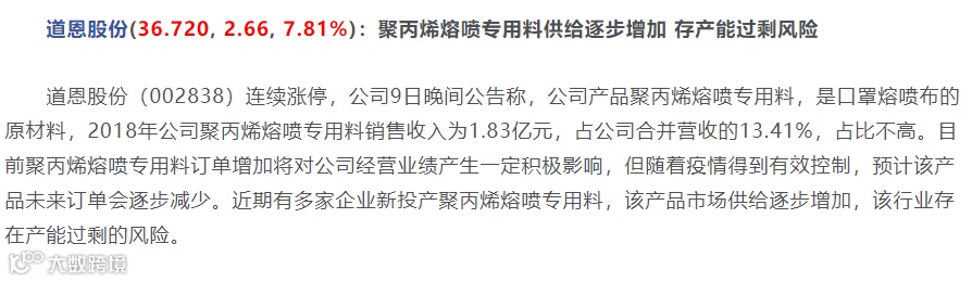 经观察者网梳理,除道恩股份外,在中石化、上海石化等纷纷转产口罩原材料后,近日股价接连上涨的口罩原料供应商国恩股份、沃特股份、南京聚隆等,均在公告中提示该行业存在产能过剩的风险。