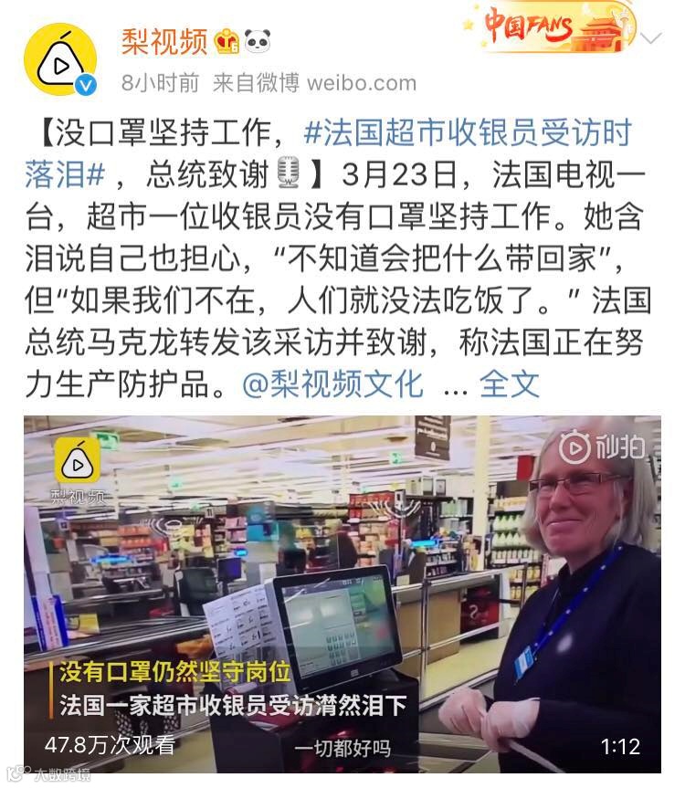 同样欧美地区的法国,由于口罩紧缺,坚守岗位的一线收银人员都无法买到口罩,含泪说担心把病毒带回家。