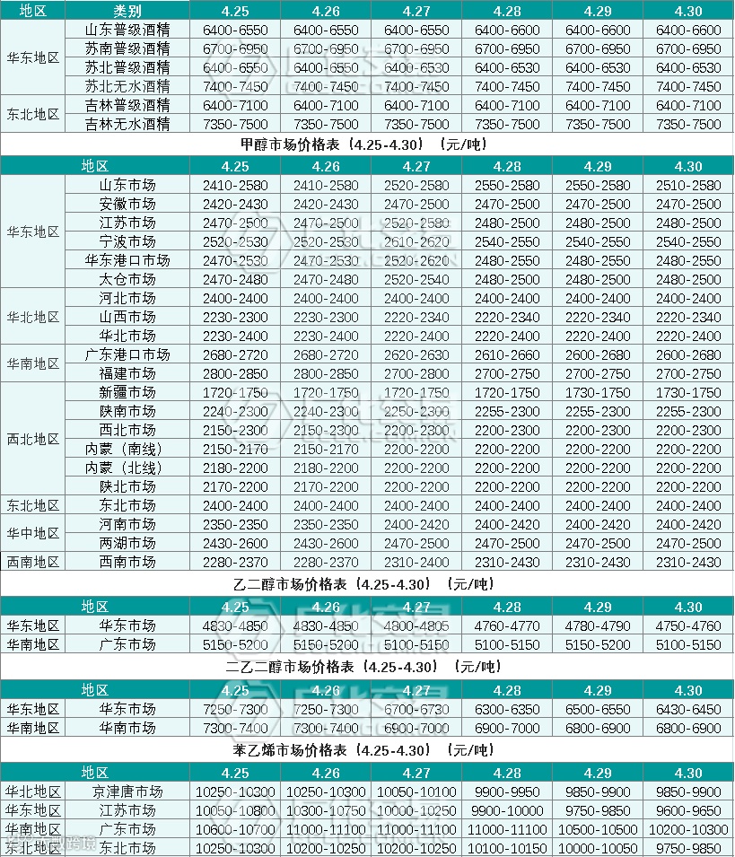 醇类报价(4.25-4.30)