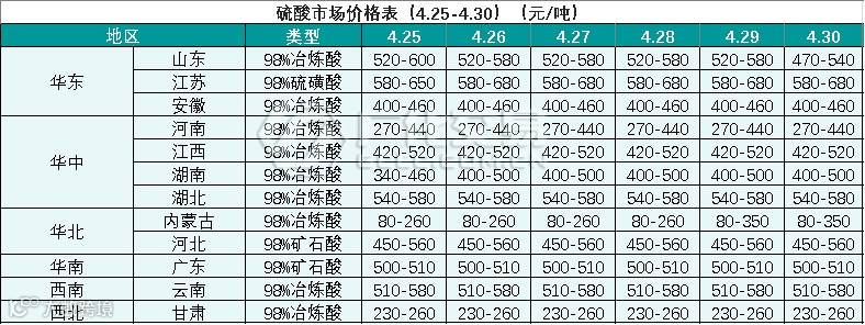 硫酸报价(4.25-4.30)