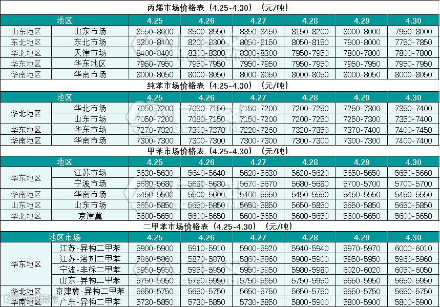 烃类报价(4.25-4.30)