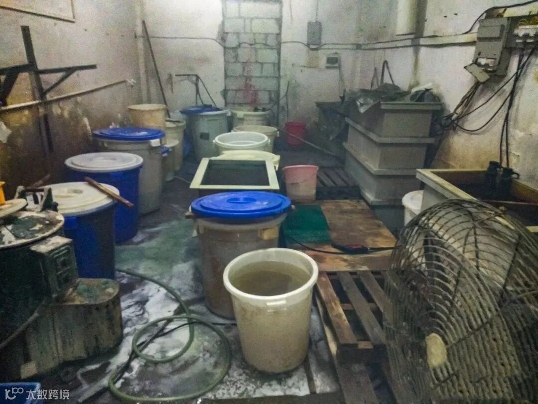 进入作坊后,执法人员发现现场没有进行生产,但环境恶劣,地面污水横流,空气中弥漫着白色雾状气体,且能闻到一股刺鼻的气味。车间内设有脱水机、酸洗槽、清洗槽以及十多个塑料清洗桶。