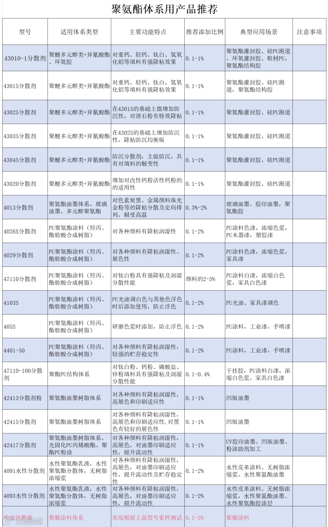 需分散剂具有亲水性(如含聚乙二醇链段的嵌段分散剂),且耐水性体系的 pH 波动(如非离子型水性聚氨酯分散剂不受酸碱度影响),如4091。 -