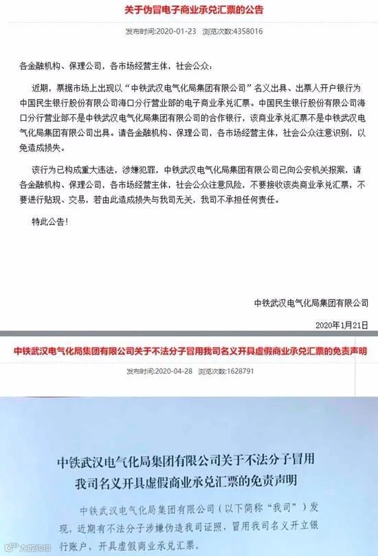 2020年6月,中铁武汉电气化局集团有限公司发表声明称,近期有不法分子涉嫌伪造证照,冒用其名义开立银行账户,开具虚假商业承兑汇票。提醒凡是出票日期在2020年1月20日(含当日)之后,在建设银行武汉光谷自贸区分行以外的金融机构开具的商业承兑汇票,均为冒名或伪造票据。企业严禁也从未允许下属各级单位开具商业承兑汇票,凡以其下属各级单位名义开具的商业承兑汇票,均为冒名或伪造票据。