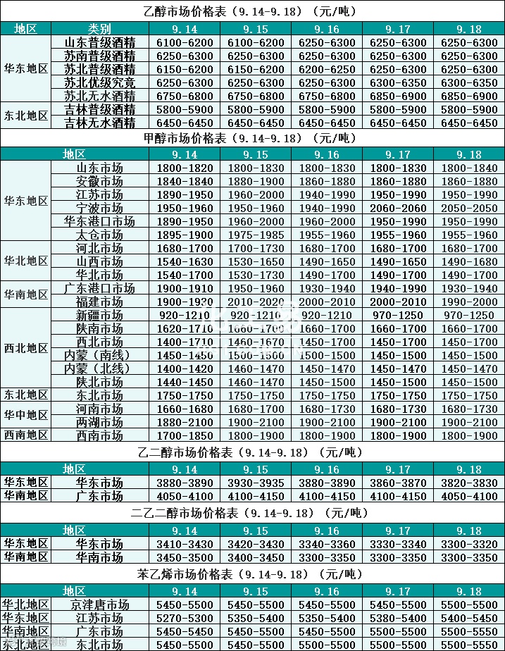 醇类报价(9.14-9.18)