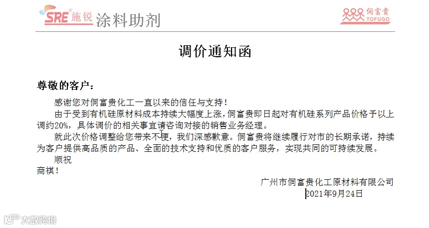 由于受到有机硅原材料成本持续大幅度上涨,侗富贵即日起对有机硅系列产品价格上调约20%,具体调价的相关事宜请咨询对接的销售业务经理。