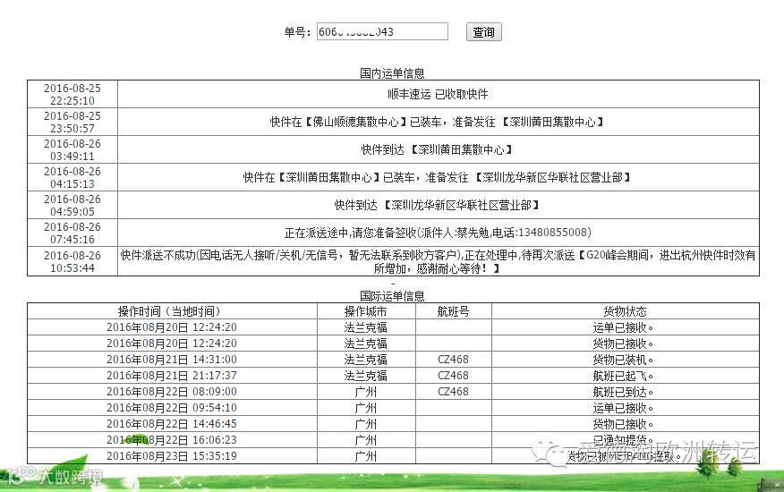 8月20日的航班,包裹很快清关完成,交给了顺丰的快递小哥,26日已经在安排派送了,这速度简直杠杠的,可是快递小哥都把包裹送到门口了,我们的包裹主人却没接电话哦,亲,你的包裹现在又孤孤单单躺在快递公司了,继续派送一定要注意接听电话哦。