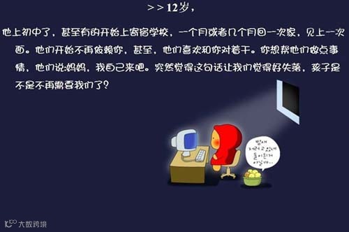 12岁他上初中了,甚至有的开始上寄宿学校,一个月或几个月回一次家,见上一次面。他们开始不再依赖你,甚至,他们喜欢和你对着干。