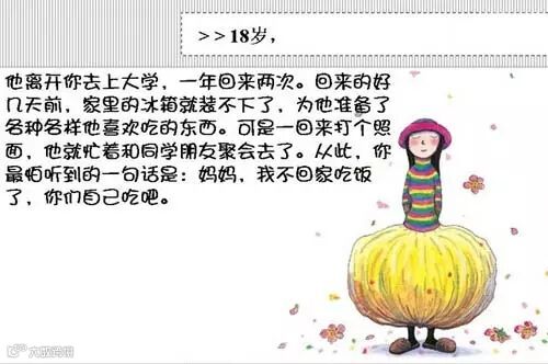 18岁他离开你去上大学,一年回来两次。回来的好几天前,家里的冰箱就装不下了,准备了各种各样他喜欢吃的东西。