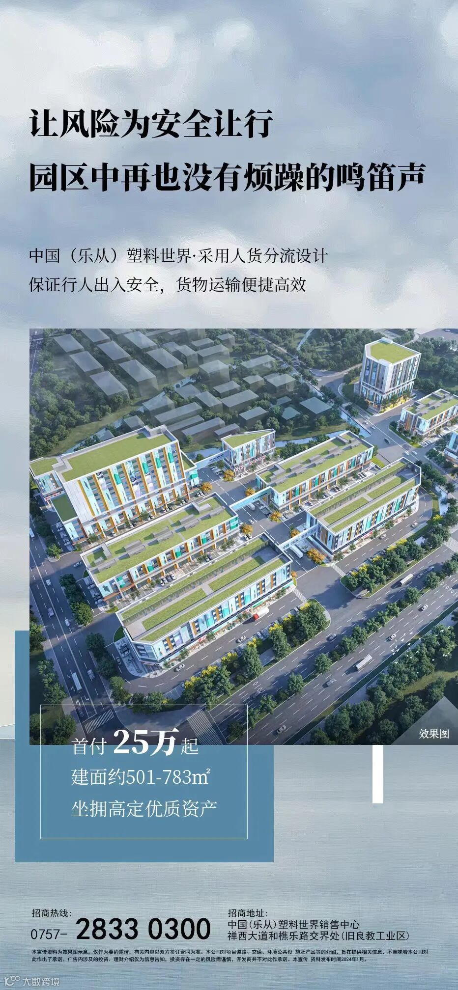 中国(乐从)塑料世界地处乐西路及禅西大道双工业干道的交汇处,四高速环绕,物流路黄金中心。首期占地约280亩,总规划建面约70万㎡,中期规划占地超千亩,规划打造成全球塑料产业的集散交易中心、价格信息中心、物流金融中心,建设集塑料商贸、现代高标准仓储、企业总部、技术研发检测、综合配套等功能于一体的新型综合园区,打造塑料产业集群转型发展的示范样板。未来将重点打造塑料高端研发中心,打造产学研基地吸纳更多高精尖人才,为乐从塑料产业进阶发展注入科研力量,提升乐从塑料行业的竞争力和可持续性发展。