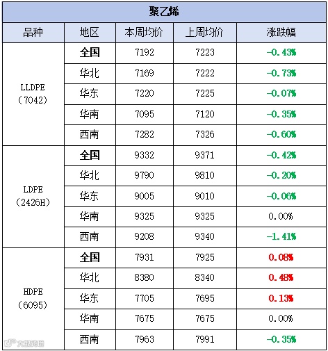 本周聚乙烯市场震荡回调,价格以跌为主。LLDPE(7042)市场均价为7192元/吨,较上周均价下跌31元/吨,跌幅为0.43%;LDPE(2426H)市场均价为9332元/吨,较上周均价下跌39元/吨,跌幅为0.42%;HDPE(6095)市场均价为7931元/吨,较上周均价上涨6元/吨,涨幅为0.08%。