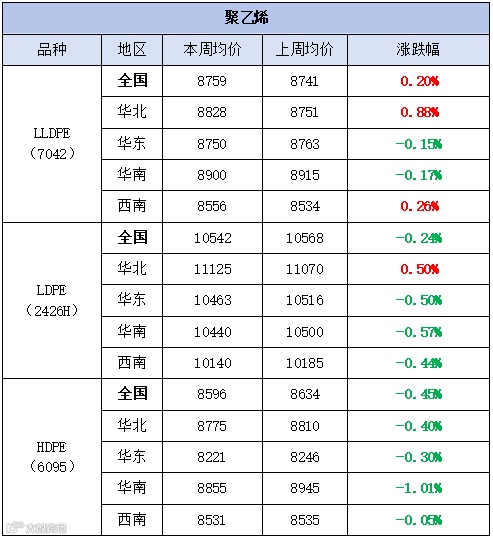 本周聚乙烯市场震荡走弱,价格跌多涨少。LLDPE(7042)市场均价为8759元/吨,较上周均价上涨18元/吨,涨幅为0.20%;LDPE(2426H)市场均价为10542元/吨,较上周均价下跌26元/吨,跌幅为0.24%;HDPE(6095)市场均价为8596元/吨,较上周均价下跌39元/吨,跌幅为0.45%。