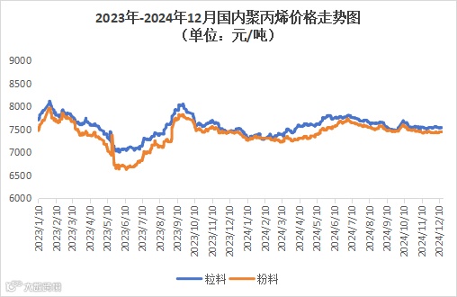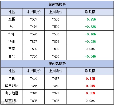 本周聚丙烯市场震荡上行,价格以涨为主。粉料全国均价为7537元/吨,较上周均价下跌19元/吨,跌幅为0.25%。粒料全国均价为7446元/吨,较上周均价上涨9元/吨,涨幅为0.12%。